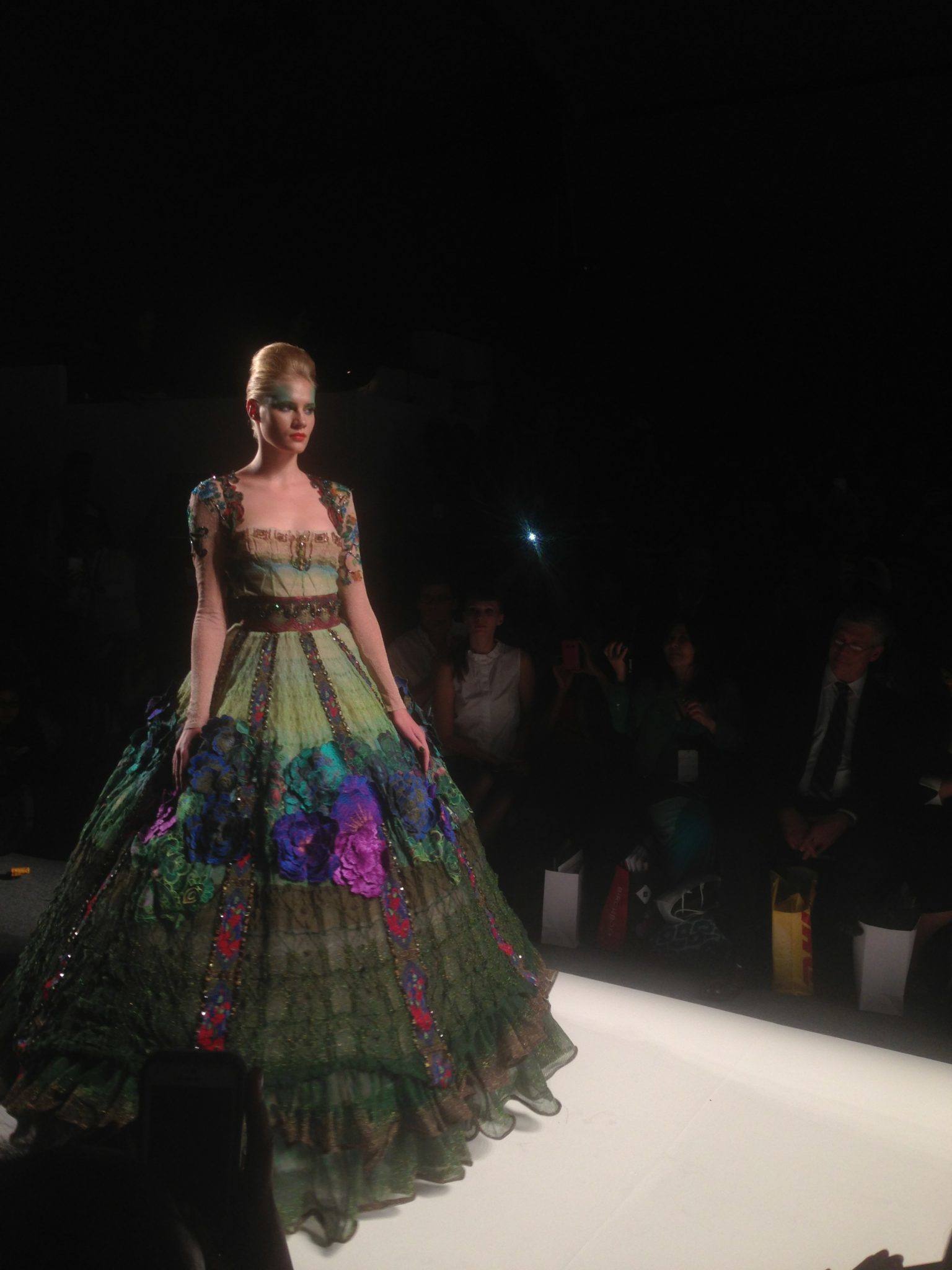 The lights dimmed, the music transitioned, and so did the fashion. The beautifully intricate dresses of Deng Hao began to descend down the runway. Most pieces are crated from knitted and woven fabrics, mixing reds and greens. There are no limitation in the designer’s use of colors and patterns. Much of Deng Hao’s inspiration comes from architecture, with the flower being a key element to most of the designs. These dresses were truly pieces of art on the runway. The last dress to go down the runway with its large skirt, was an absolute show stopper. It received an ovation when the model turned at the end of the runway.