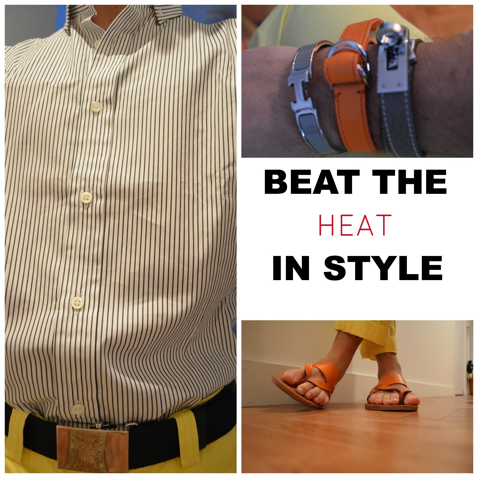 Here, I’ve taken a summer essential, chinos, and paired with a contrasting button down. The chinos are in a ultra lightweight fabric perfect for summer. I opt for chinos as much as possible because they look more put together than a pair of shorts. The black stripe in the button down makes for a nice contrast with the yellow of the pants. I completed the look with a casual yet sophisticated Prada webbed belt. And because it has been SO hot here in the city, a pair of leather sandals by Ralph Lauren completes the look for maximum comfort. Casual bracelets are very trendy for men right now, from leather to string and anything in between. To accessorize this look, I added a few bracelets, one of which ties back to the color of the sandal.
