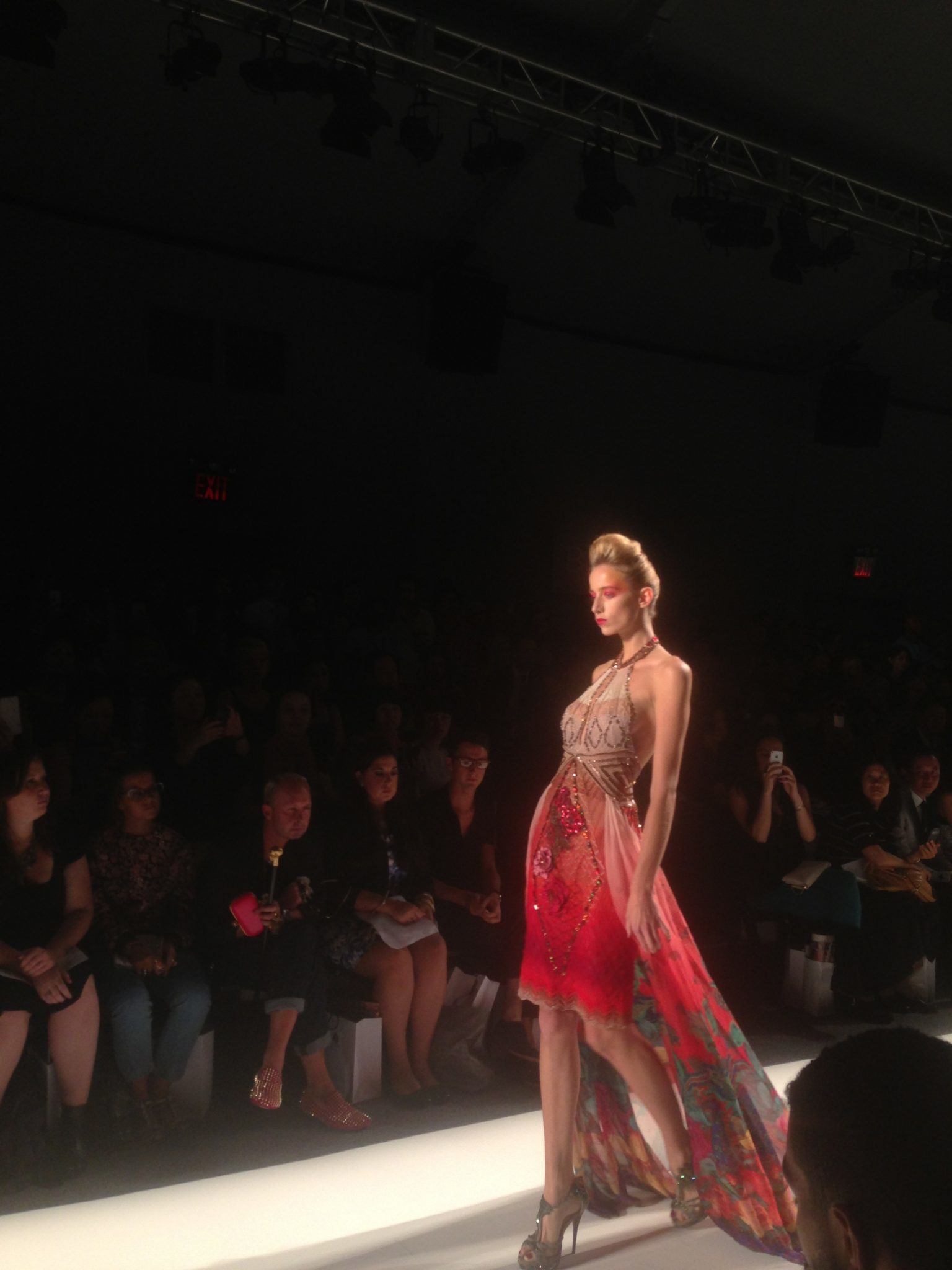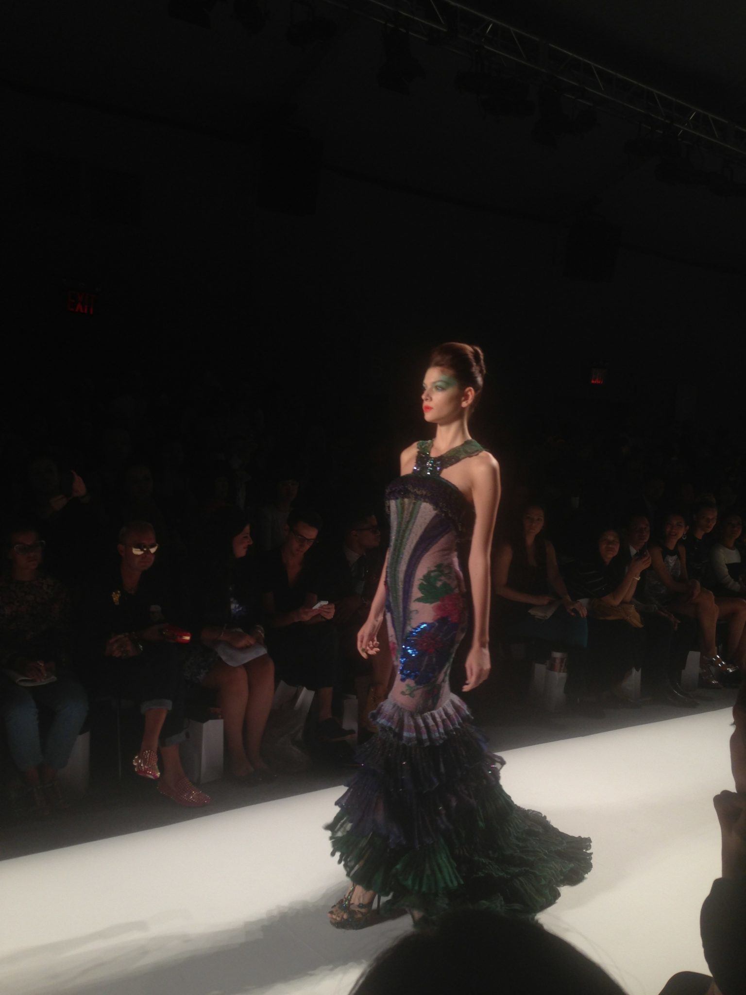 The lights dimmed, the music transitioned, and so did the fashion. The beautifully intricate dresses of Deng Hao began to descend down the runway. Most pieces are crated from knitted and woven fabrics, mixing reds and greens. There are no limitation in the designer’s use of colors and patterns. Much of Deng Hao’s inspiration comes from architecture, with the flower being a key element to most of the designs. These dresses were truly pieces of art on the runway. The last dress to go down the runway with its large skirt, was an absolute show stopper. It received an ovation when the model turned at the end of the runway.