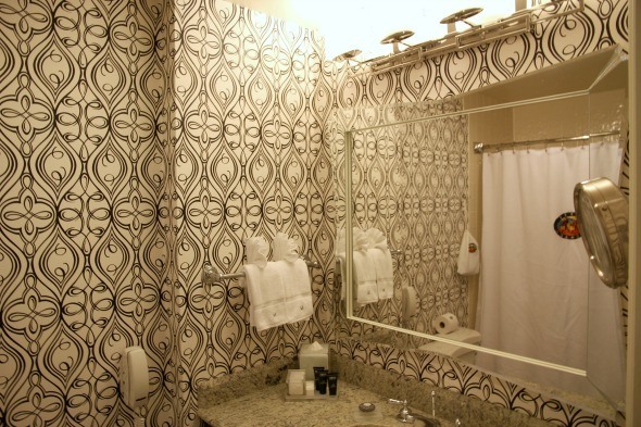 The design touches continued into the bathroom as seen with the contemporary black and white wallpaper and Italian cotton waffle weave shower curtain.