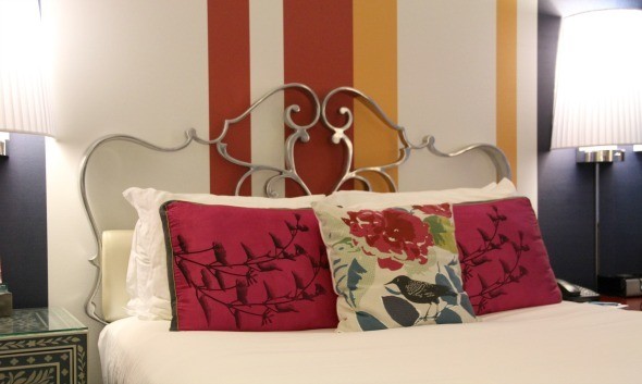 My favorite part of my queen room is the French Art Nouveau headboard and vibrant and luxurious silk pillows.