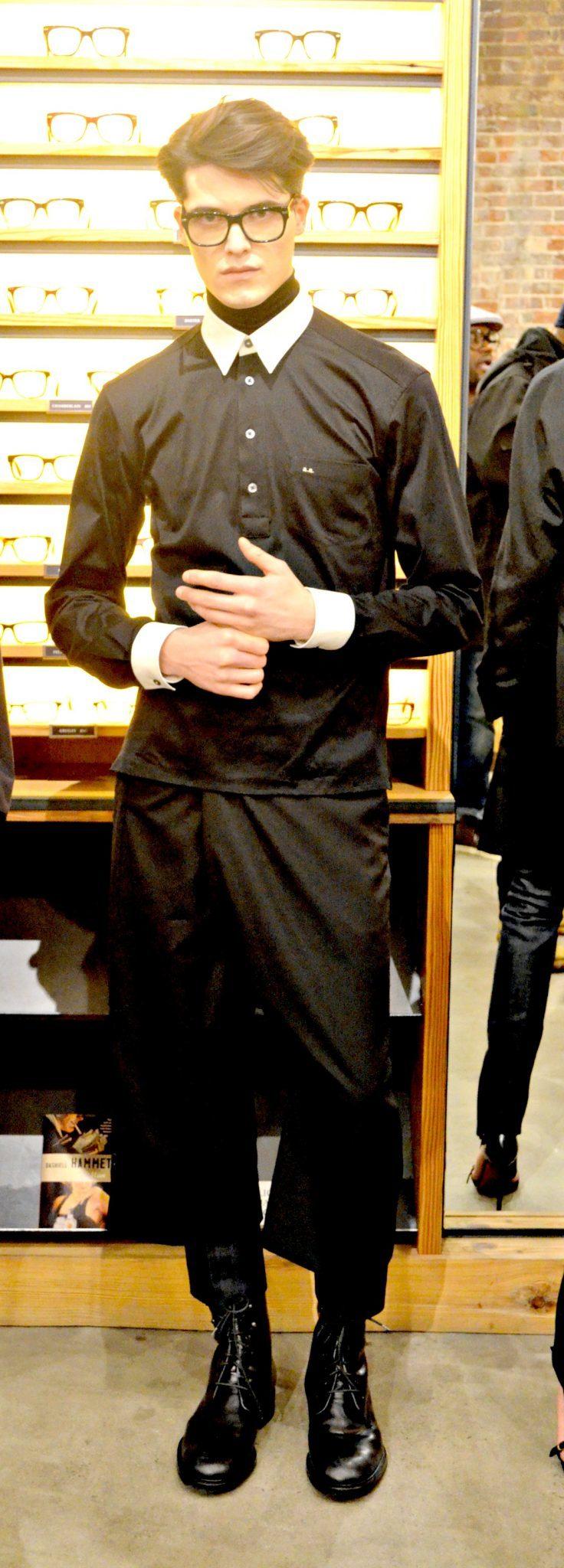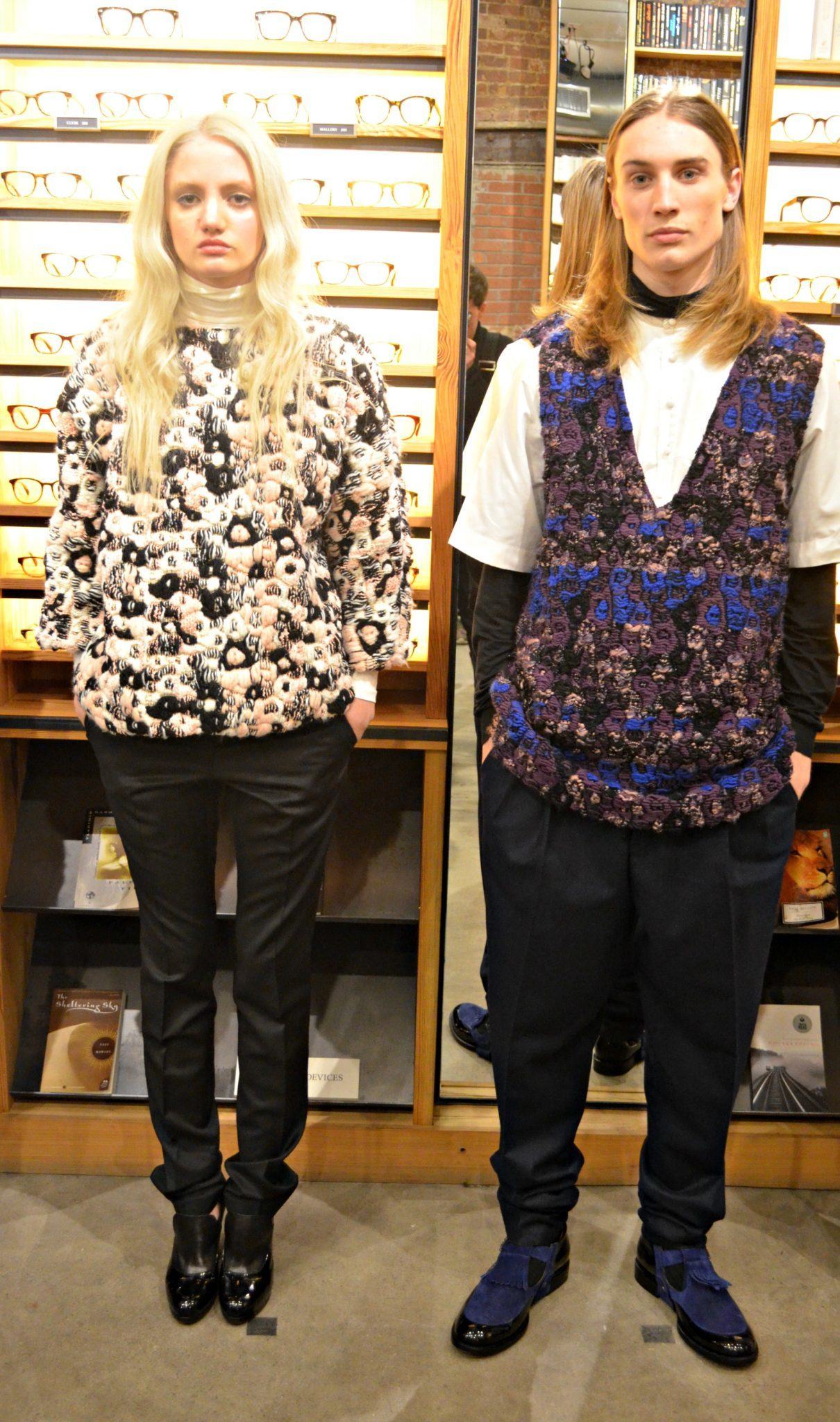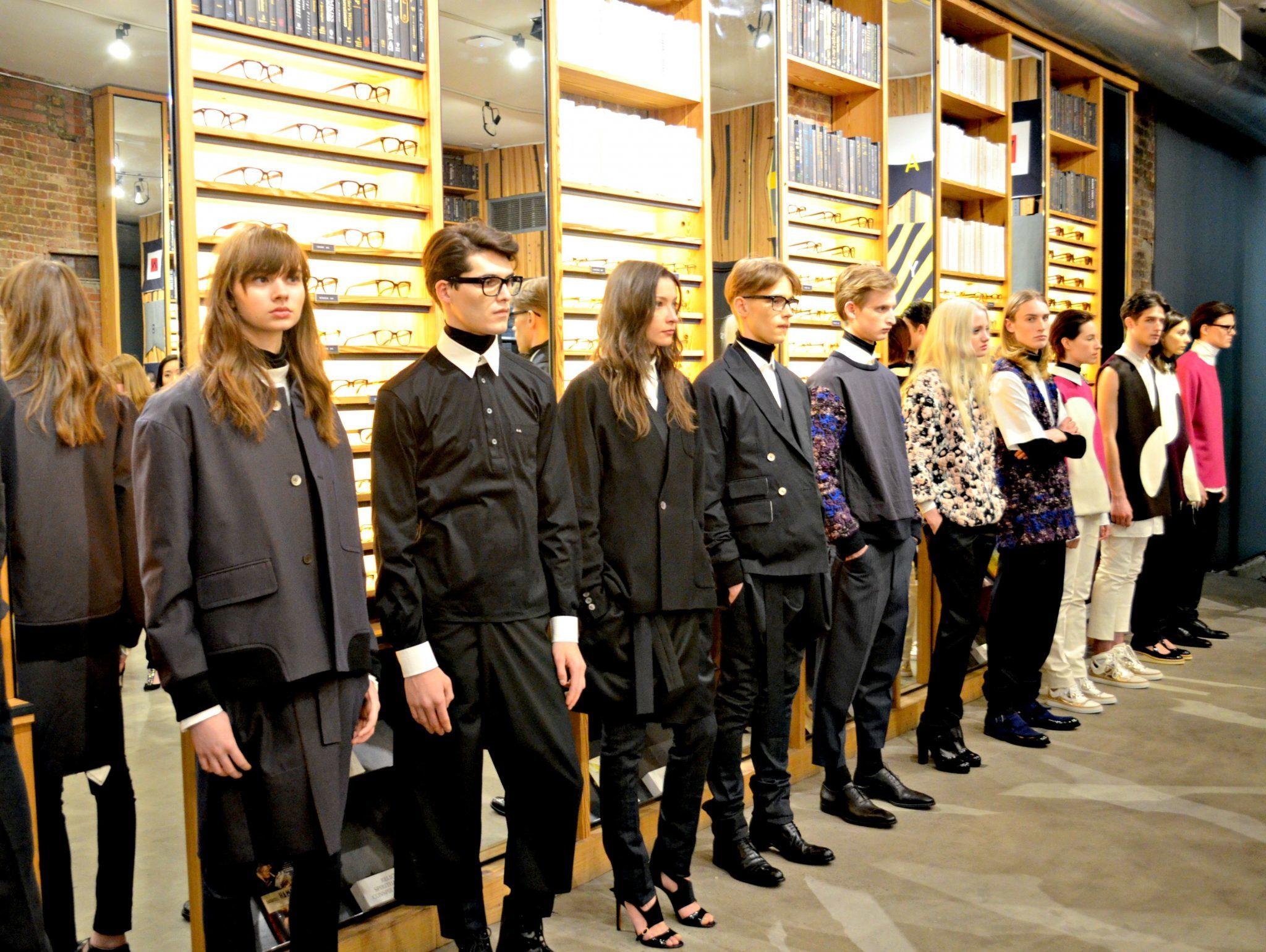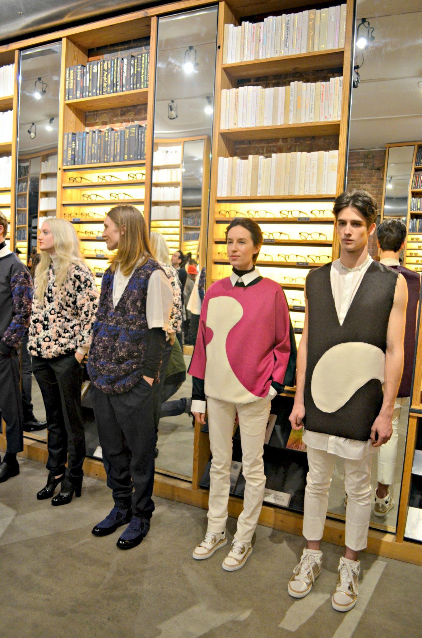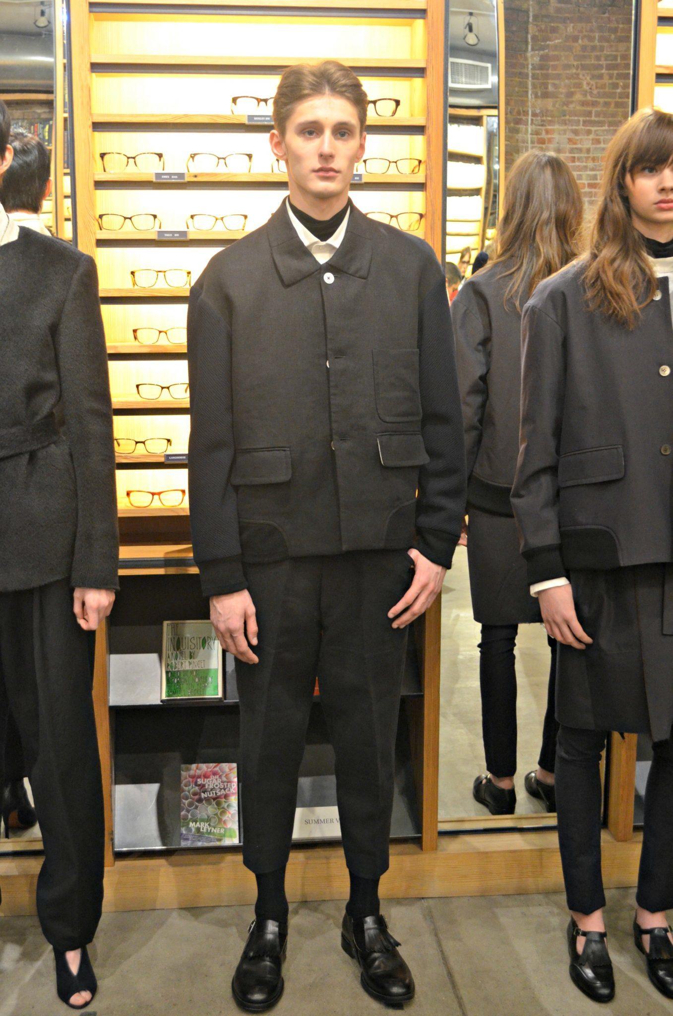 The presentation was held at the stylish and trendy eyewear brand, Warby Parker, boutique in Meatpacking District. Warby Parker eye can be seen on the models. For the Fall/Winter 2014 collection, Azzuolo mixes luxury tailoring with a downtown “cool.” It is a Saville Row meets the Lower East Side if you will. I personally loved this. I think for menswear the mix of a tailored shirt paired with a relaxed, drop-crotch, trimmed pant can create an amazing look.