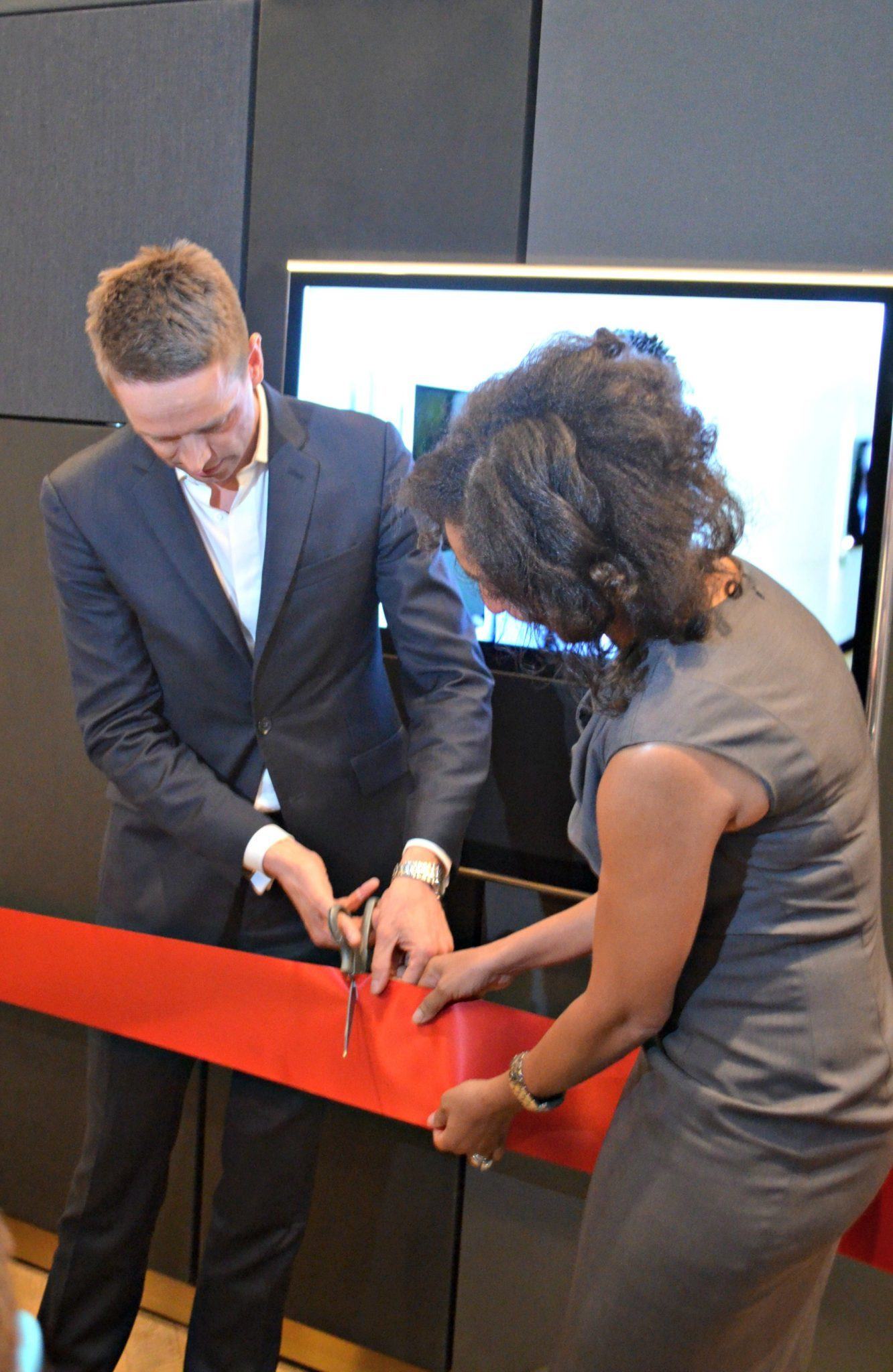 The new store concept features a luxurious and welcoming atmosphere, and the interior has been designed to captivate curiosity as you move through the store. This store concept will provide the perfect platform to interact and engage in the Bang & Olufsen universe of magical experiences.”states Kathy Thornton-Bias, President of Bang & Olufsen America, Inc. The retail concept is centered around a speaker wall that contains all the best-selling speakers. After the ribbon cutting, the seemingly bare wall turned around to reveal all the speakers, and then poof! They were gone. It is a very interesting concept that allows customers to select the speaker they are interested in, reveal it, and then stream their own content from their smartphones to check out the sound. The other zones include a dedicated B&O Play area where customers can interact with the more mobile lifestyle segment including their signature headphones, and a private area that represents the hallmark of Bang & Olufsen technology with the latest flatscreen technology and surround sound. It was a luxurious evening as guests sipped champagne and enjoyed hors d’oeuvres will enjoying the beautiful store. The new B&O Play BEOPLAY A9 invited guests into the store with their elegant design on display in the windows while Aston Martins featuring B&O sound systems attracted attention on the street outside the store. The store was officially opened with a ribbon cutting by Mr Mantoni. Photos: Wes Holland