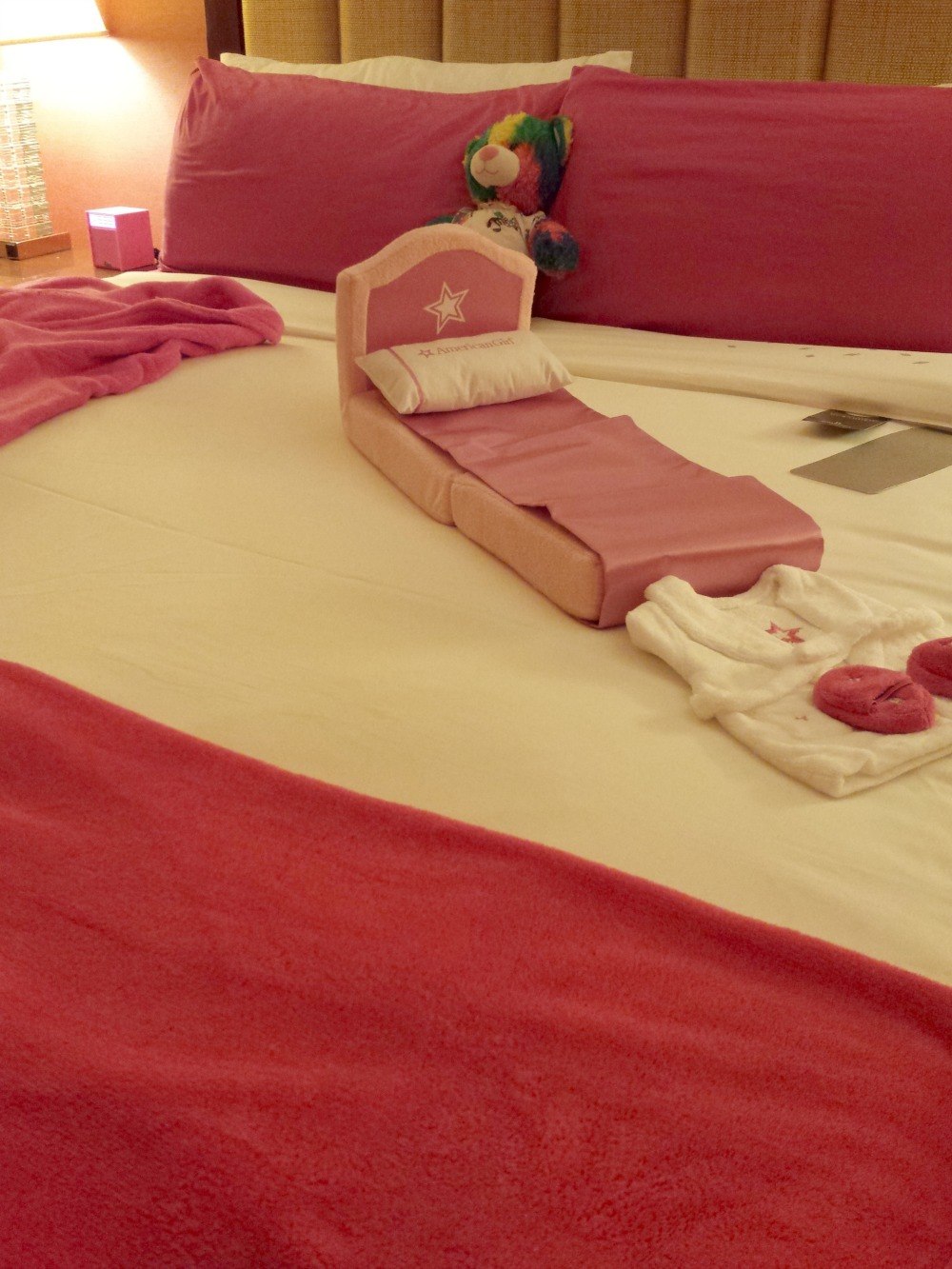 Many hotels offer American Girl packages that include a take-home doll-bed and other fun amenities such as complimentary breakfast. The packages vary from city to city, and from hotel to hotel. The Renaissance Charlotte South Park Hotel offers a basic package, but then staff decided to have even more fun by offering hot pink sheets, a pink beanbag, hot pink towels, and accessories like a pink alarm clock to make the experience a little more colorful. The Deluxe American Girl Package runs about $75 over normal room rates. The basic packages start at about $40 over rack rates. This month, the deluxe package runs about $200 night.