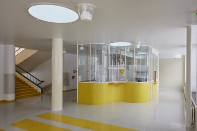 Lighting was designed to reflect the different times of the day and the needs of patient healing. Even the patient rooms got special lighting fixtures and the patient room ceilings were painted relaxing grayish green to avoid glare. Special attention was given to consciously designing what kind of psychological effects different colors would create. The husband-and-wife design team chose paint colors throughout the building to align with the patients’ healing. Calming colors in spaces where they were relaxing, and energetic colors like bright yellow in communal spaces. The long turquoise corridors were reflecting colored light even during darkness, and the building looked luminous, like a factory of healing, in the middle of the Finnish pine forest.